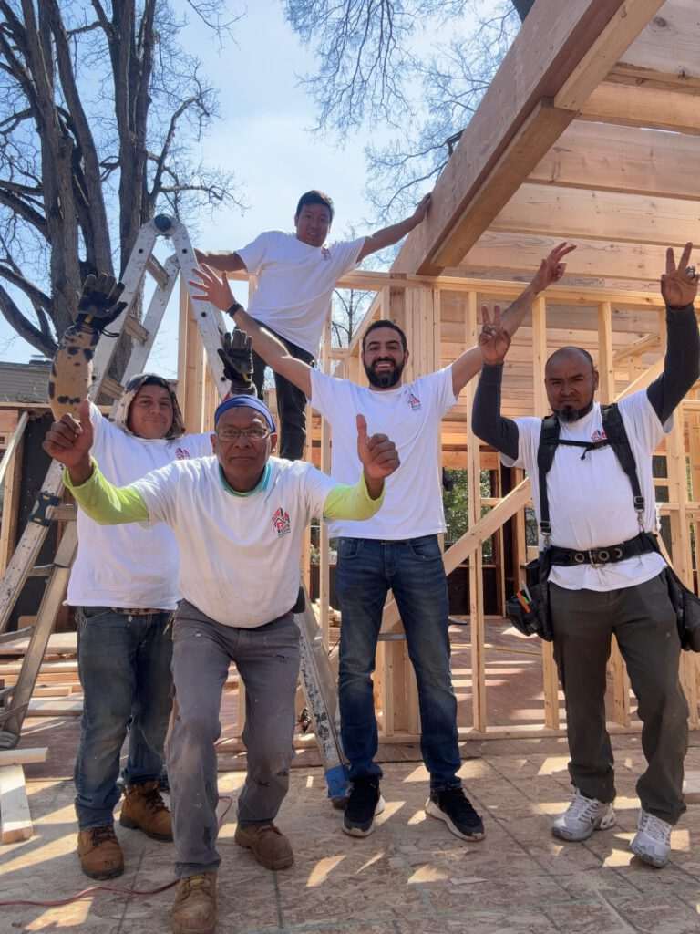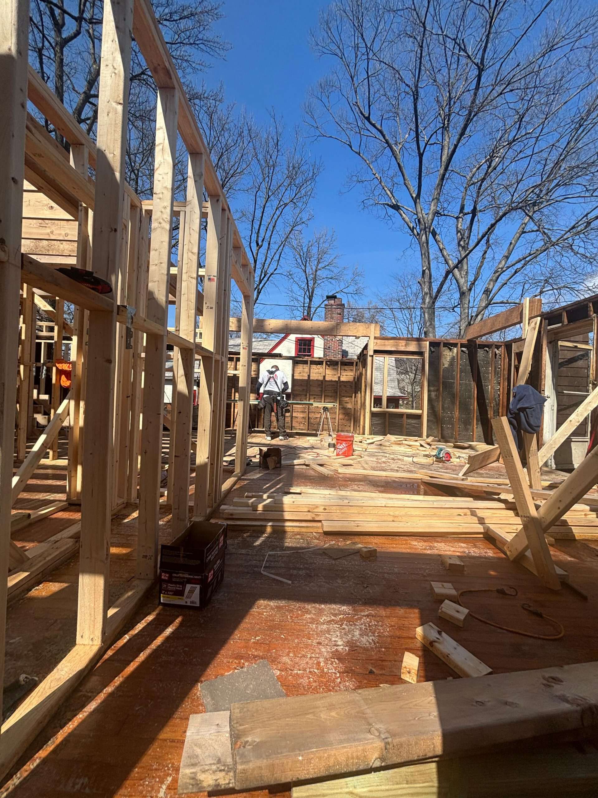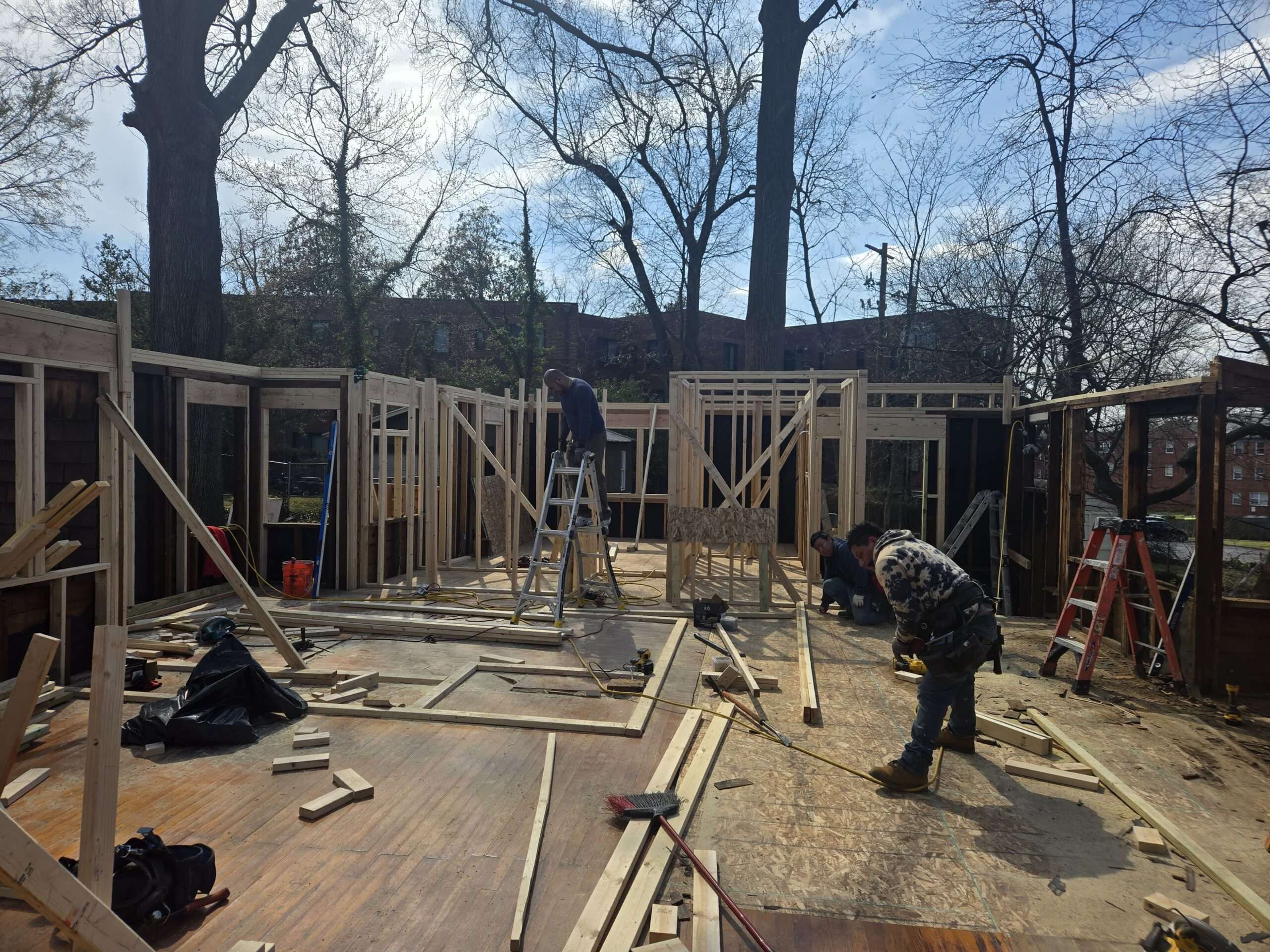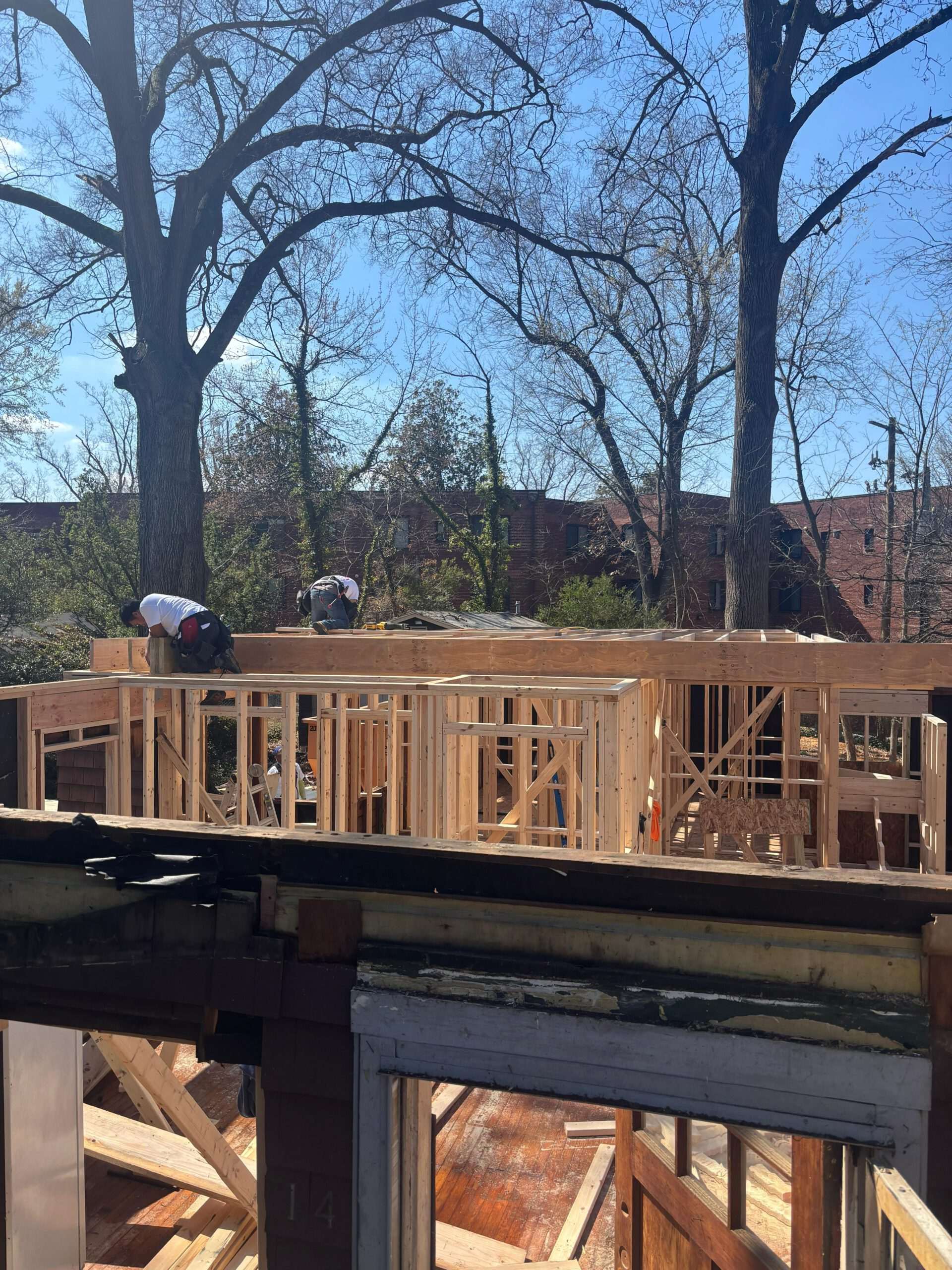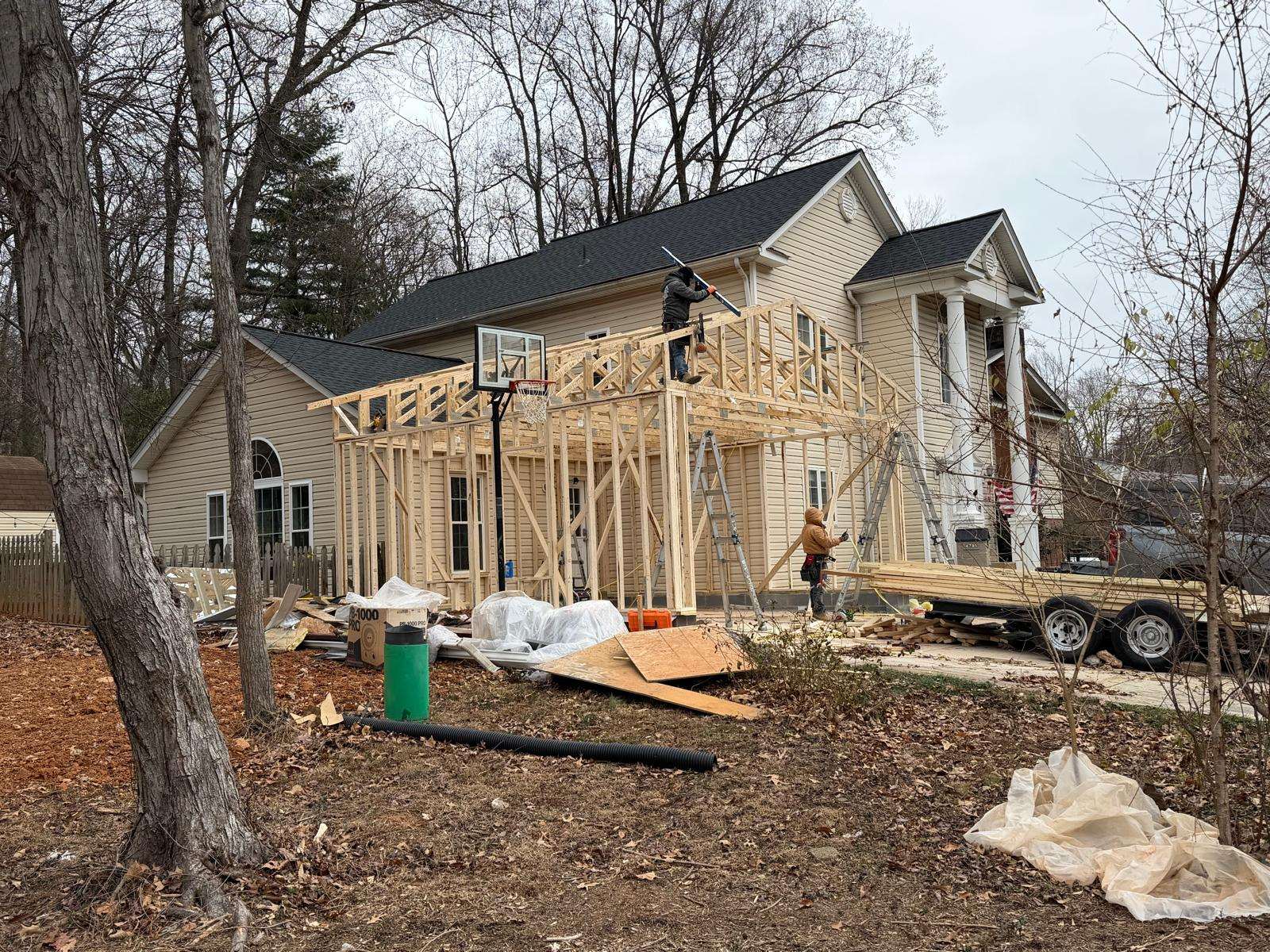 We frame exterior walls with studs, plumb layout, and headers for roof and window loads. Bracing and ladders keep crews safe while we tie new framing to the addition before sheathing closes.