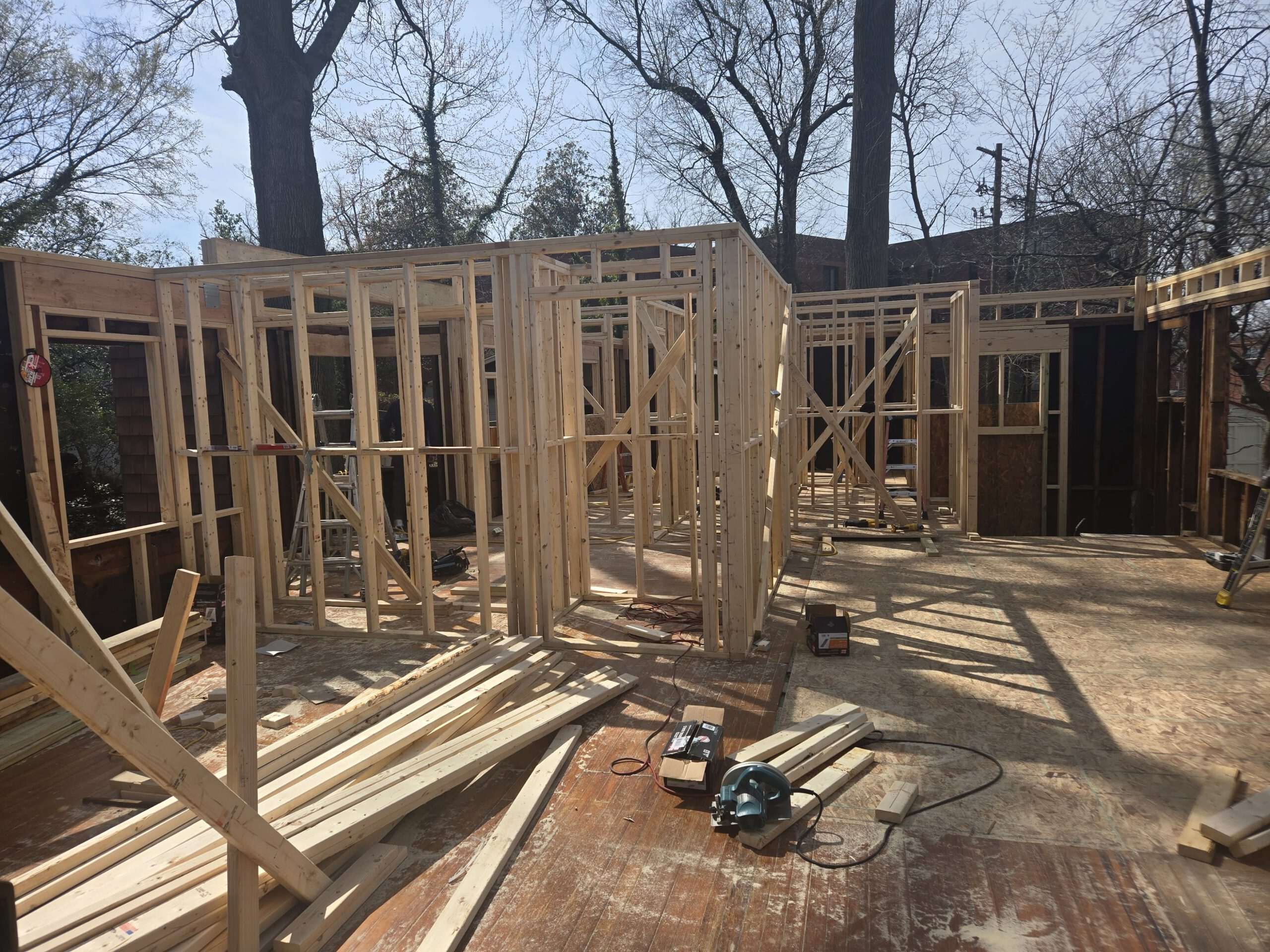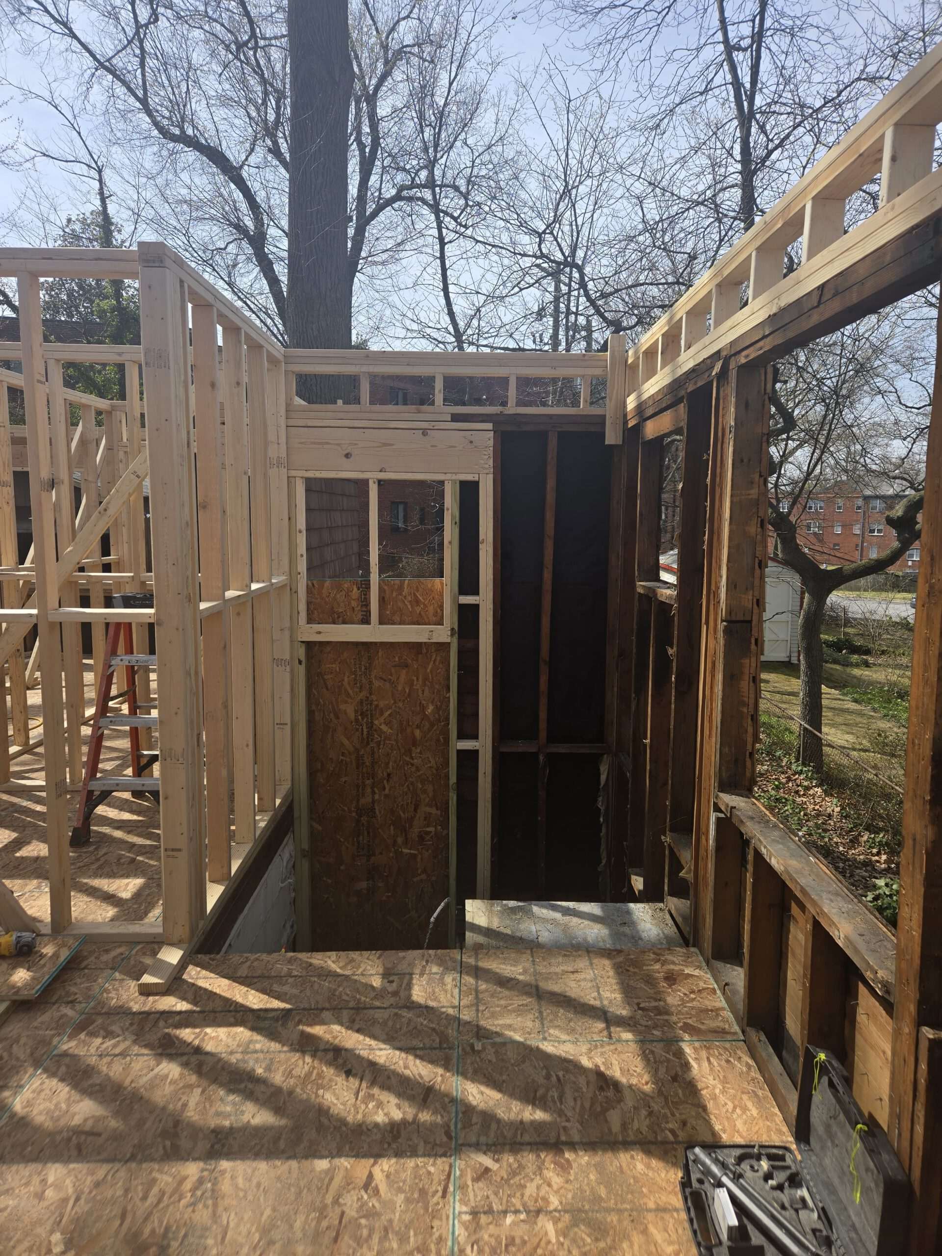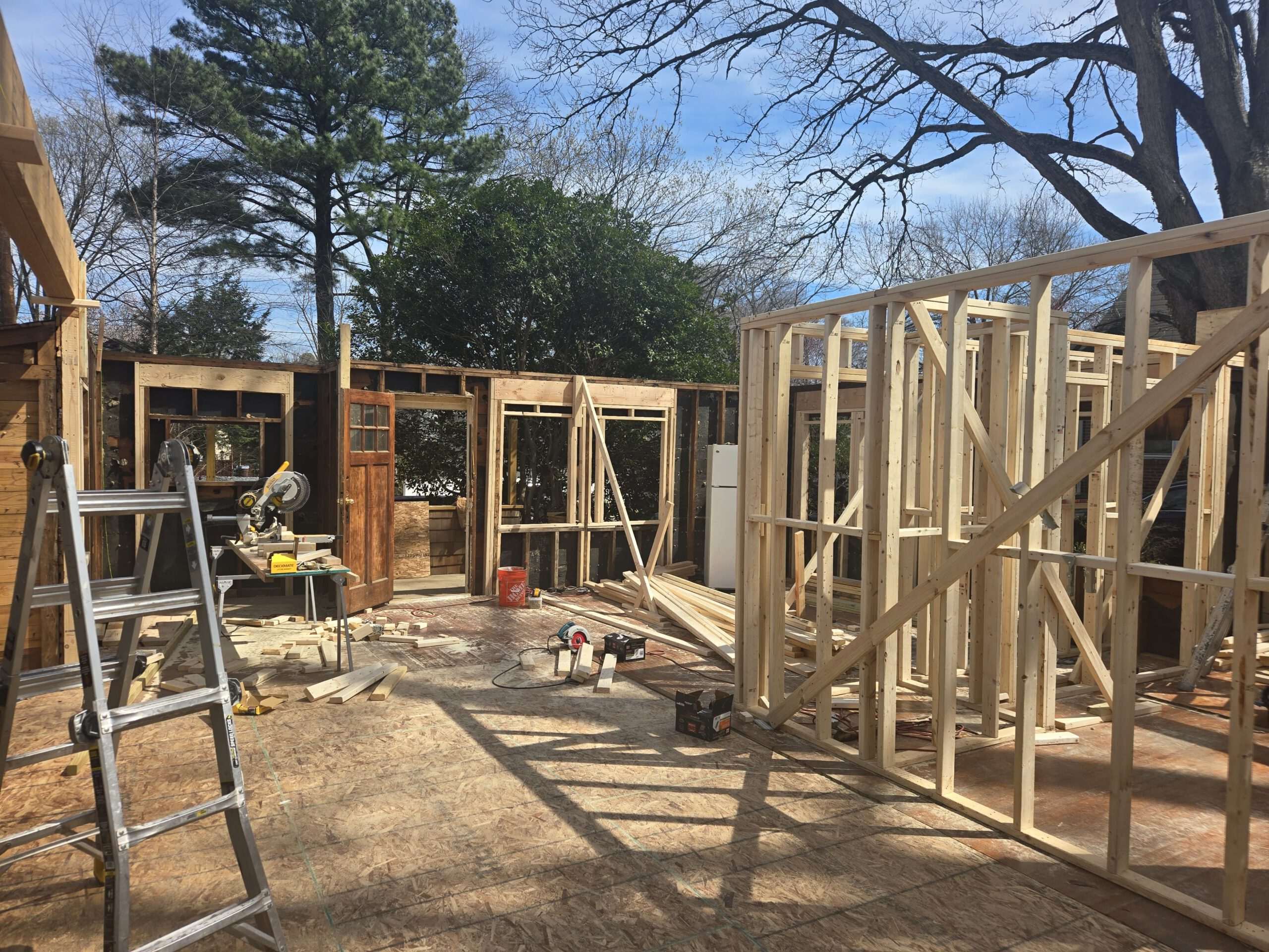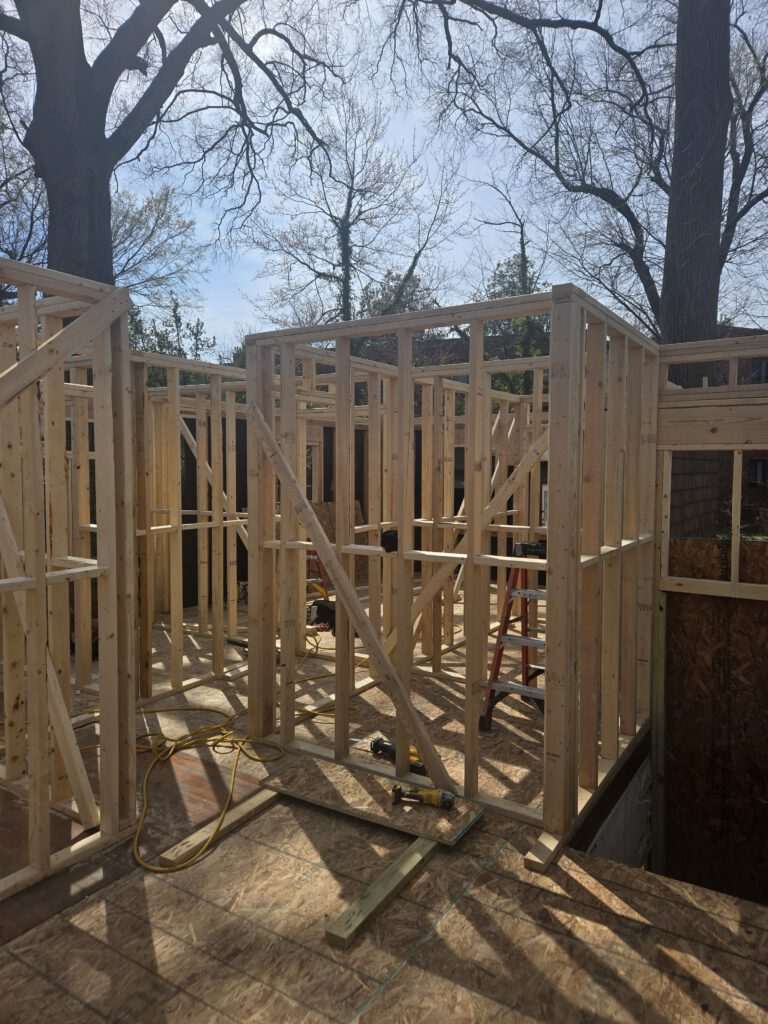 We frame addition shells with engineered studs, headers, and OSB sheathing so floors and walls stay square before finishes. Tie-ins and bracing control structural loads until the shell is weather-tight.